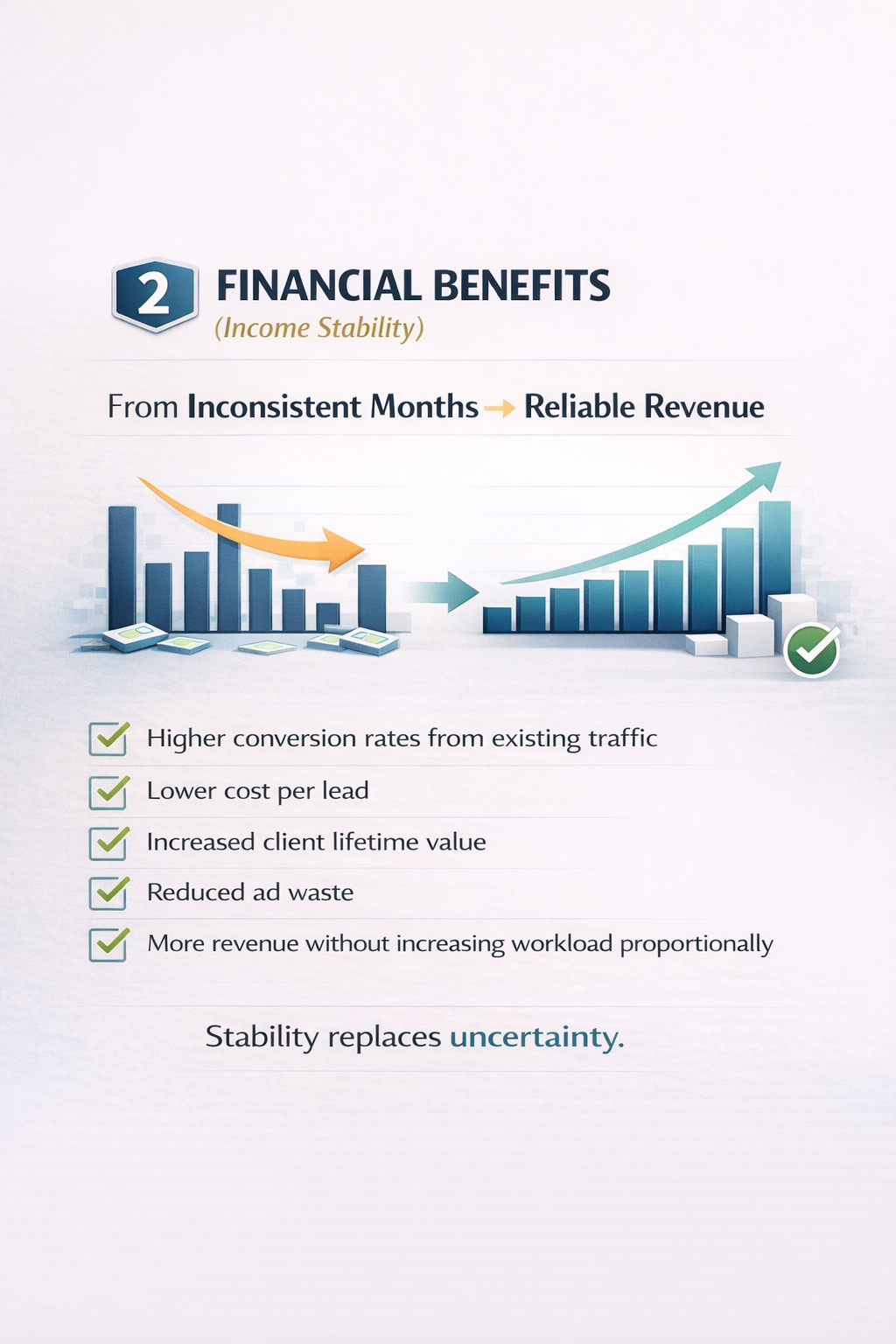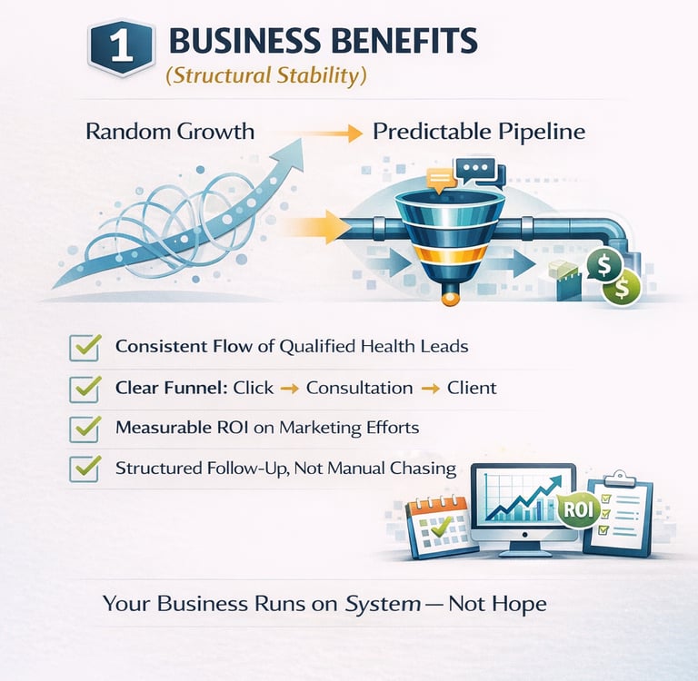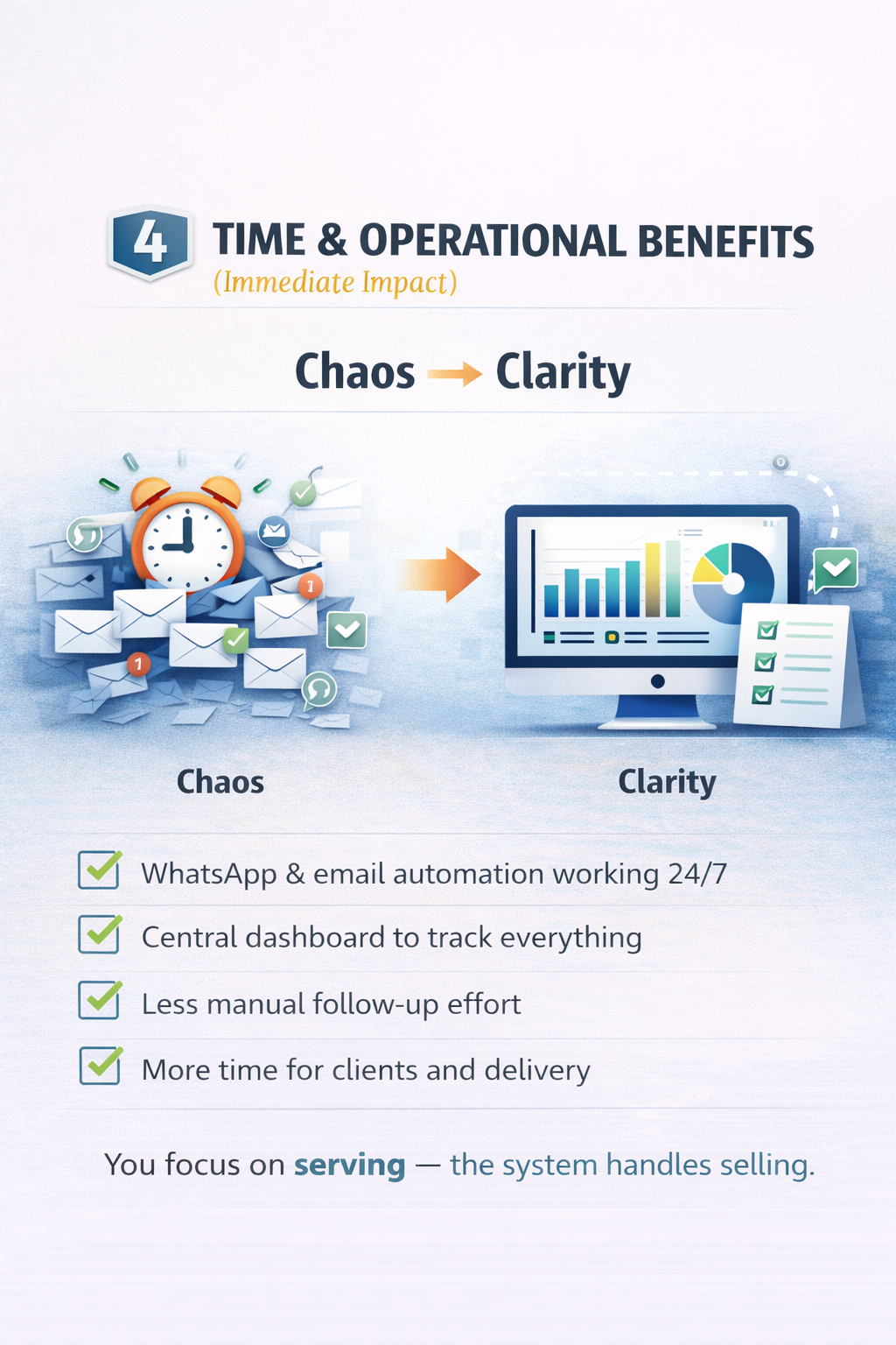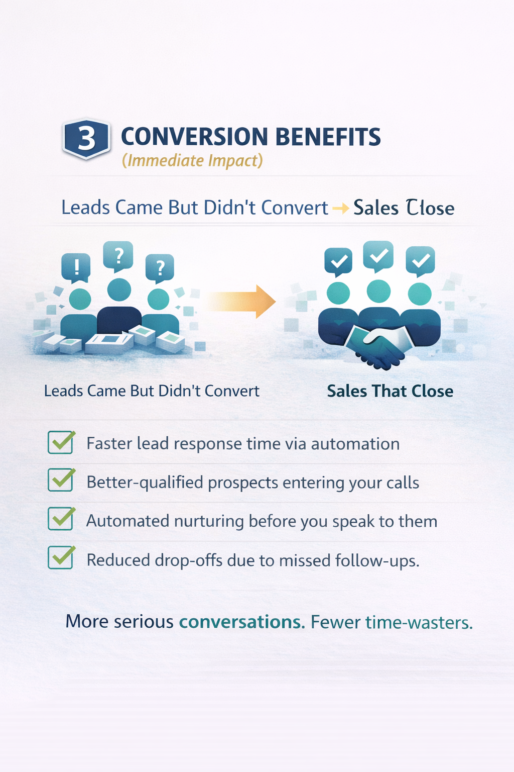 When these benefits stack together, they don’t just improve one area of your business — they transform the entire operating model. You move from unpredictable growth to a structured pipeline, from inconsistent revenue to stable income, from scattered follow-ups to automated conversions, and from stress-driven decisions to strategic scale. Each layer reinforces the next, creating a compounding effect where clarity drives confidence, systems drive sales, and positioning drives premium perception. Instead of isolated wins, you build an integrated growth engine that makes your business stronger, smarter, and more scalable over time.